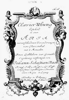 | Portada del Clavierübung IV, más tarde conocido como las Variaciones Goldberg. El subtítulo reza: "Aria con diversas variaciones para clave de dos teclados manuales". |