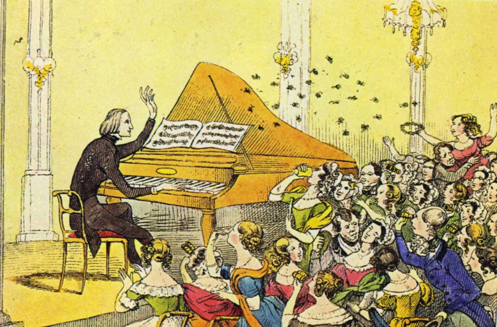 | Liszt tocando en la Academia de Canto de Berlín, donde obtuvo un éxito sin precedentes en 1842 |