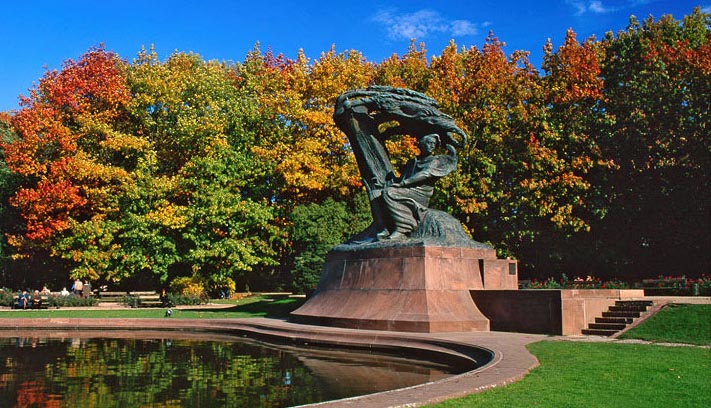 | Monumento a Chopin, en Varsovia. (Su escala es enorme, a la izquierda hay unas personas sentadas en un banco) |